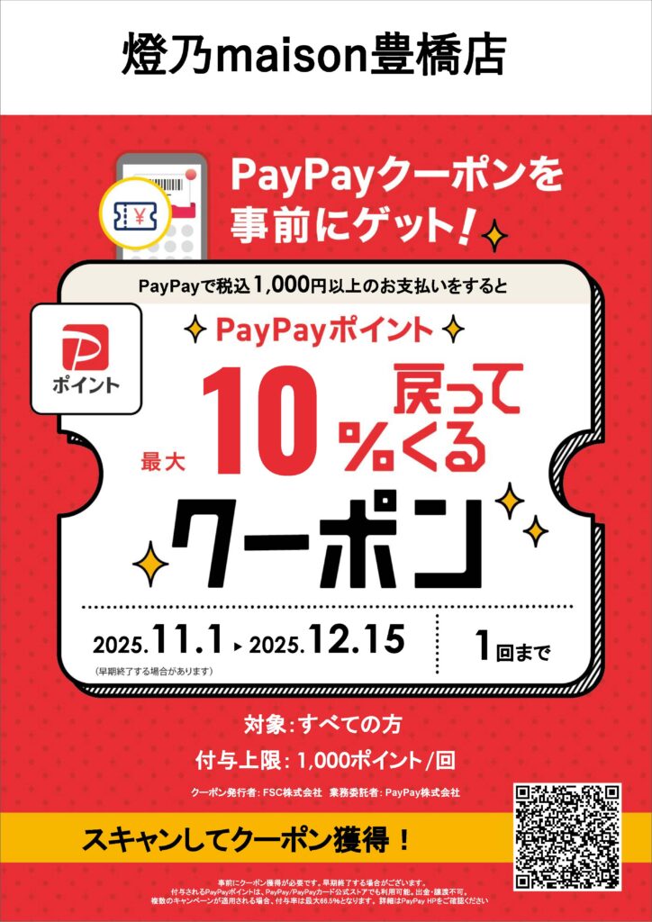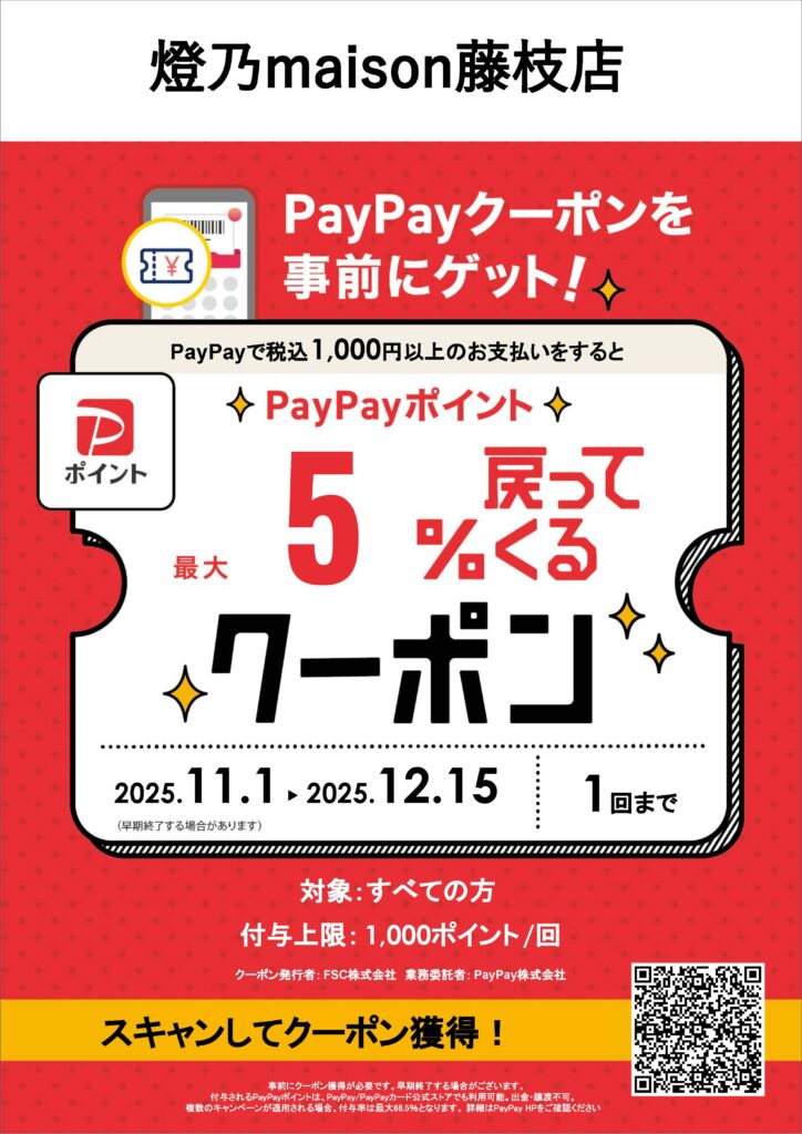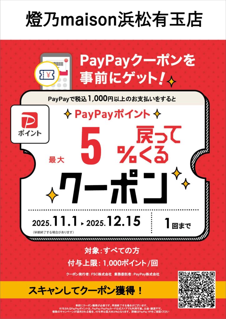 2025年11月1日(土)~12月15日(月)の期間、お支払い額から最大5~10%が戻ってくるPayPayクーポンを発行いたします!
