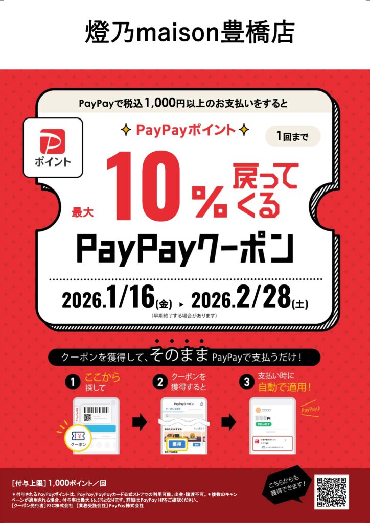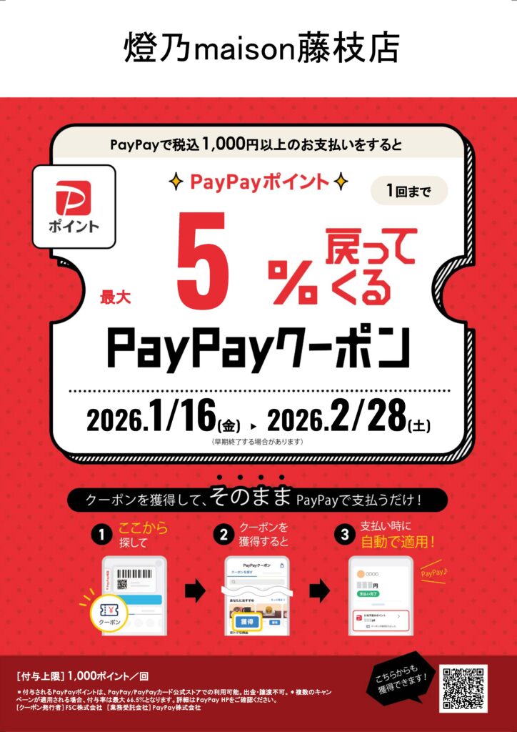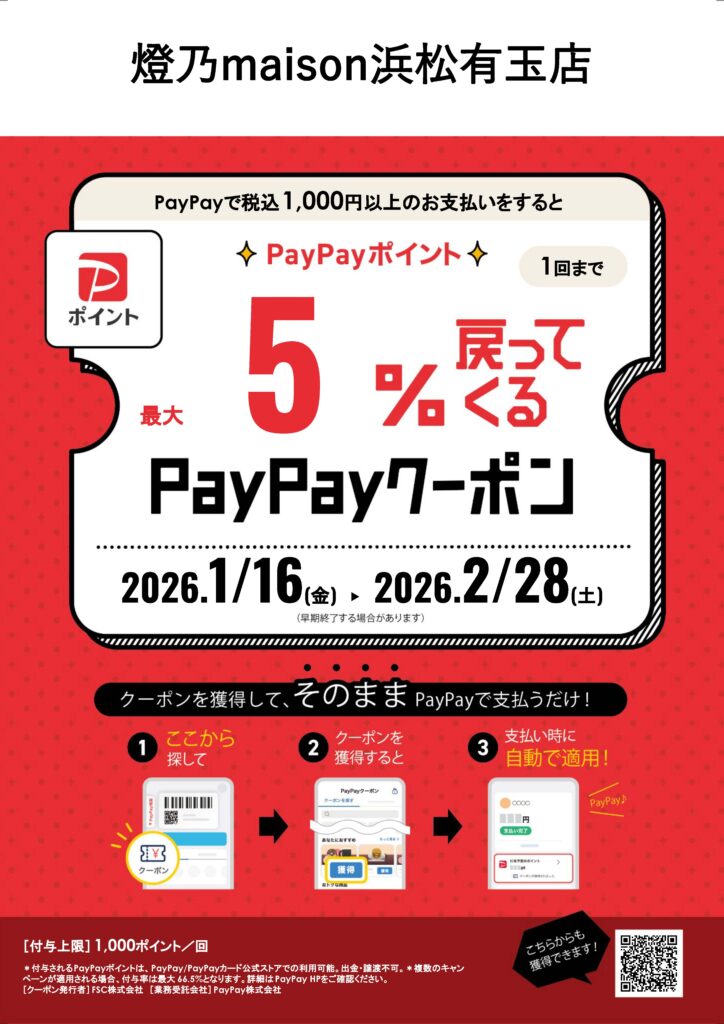 2026年1月16日(金)~2月28日(土)の期間、お支払い額から最大5~10%が戻ってくるPayPayクーポンを発行いたします!